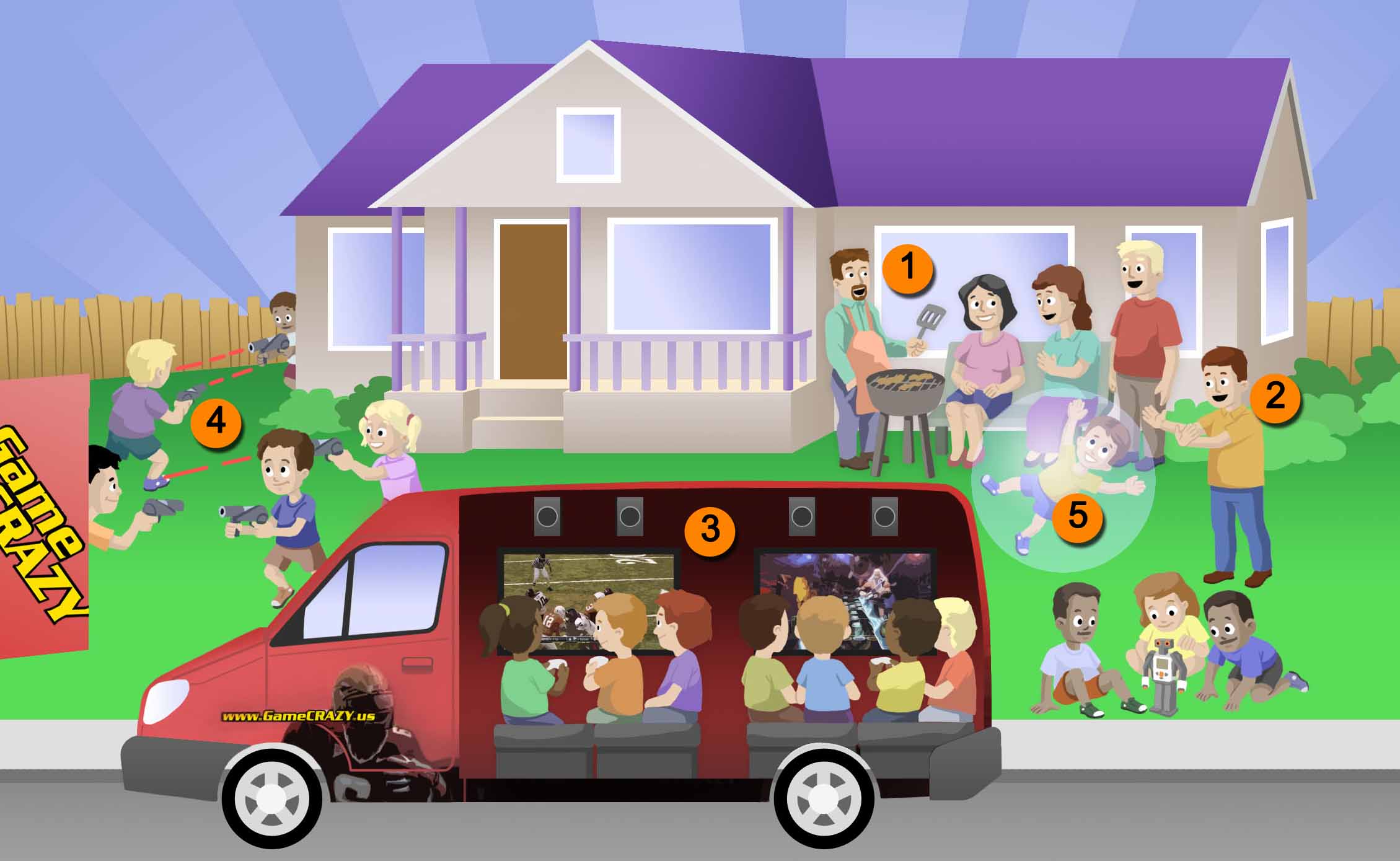 Our highly trained and friendly Game Coaches handle everything so you can relax. Make your next birthday party or corporate event memorable with our Video Game Truck, Portable Laser Tag, Angry Birds, Human Hamster Balls and much more. Free online invitations and thank you cards and our Candy Cannon make party planning a snap.